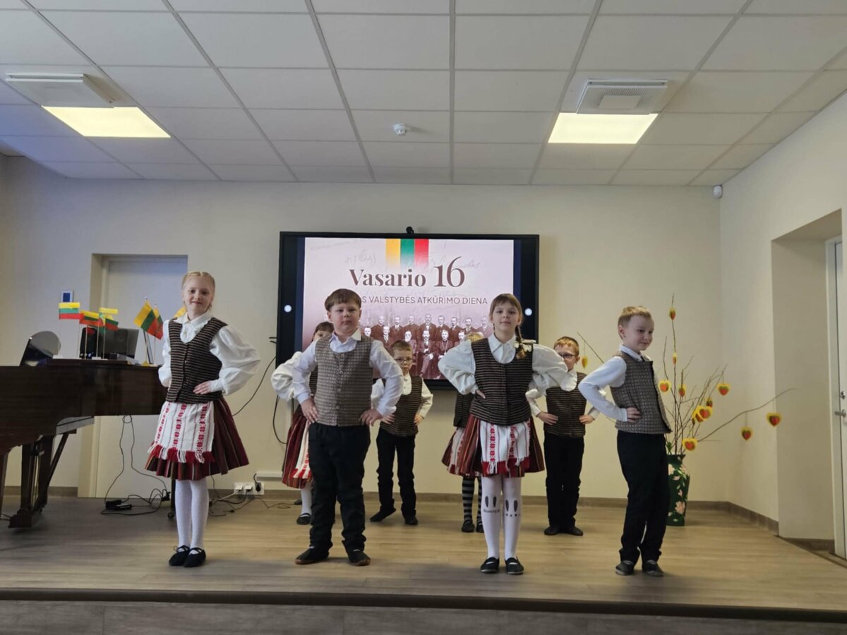 Ikimokyklinio, priešmokyklinio ugdymo grupių bei pradinių klasių mokiniai Lietuvą su gimtadieniu pasveikino itin gražiai. Salėje skambėjo vaikų dainos ir sukosi spalvingi šokiai (mokytoja Kamilė Kneitienė).