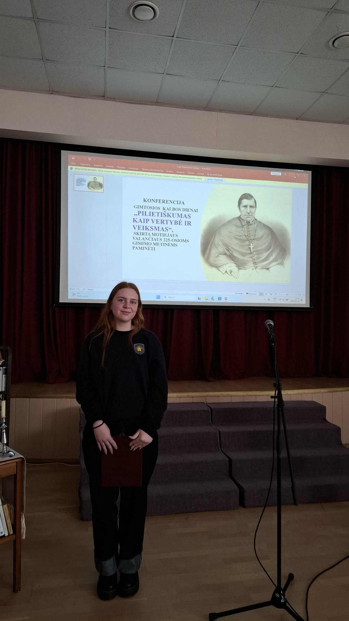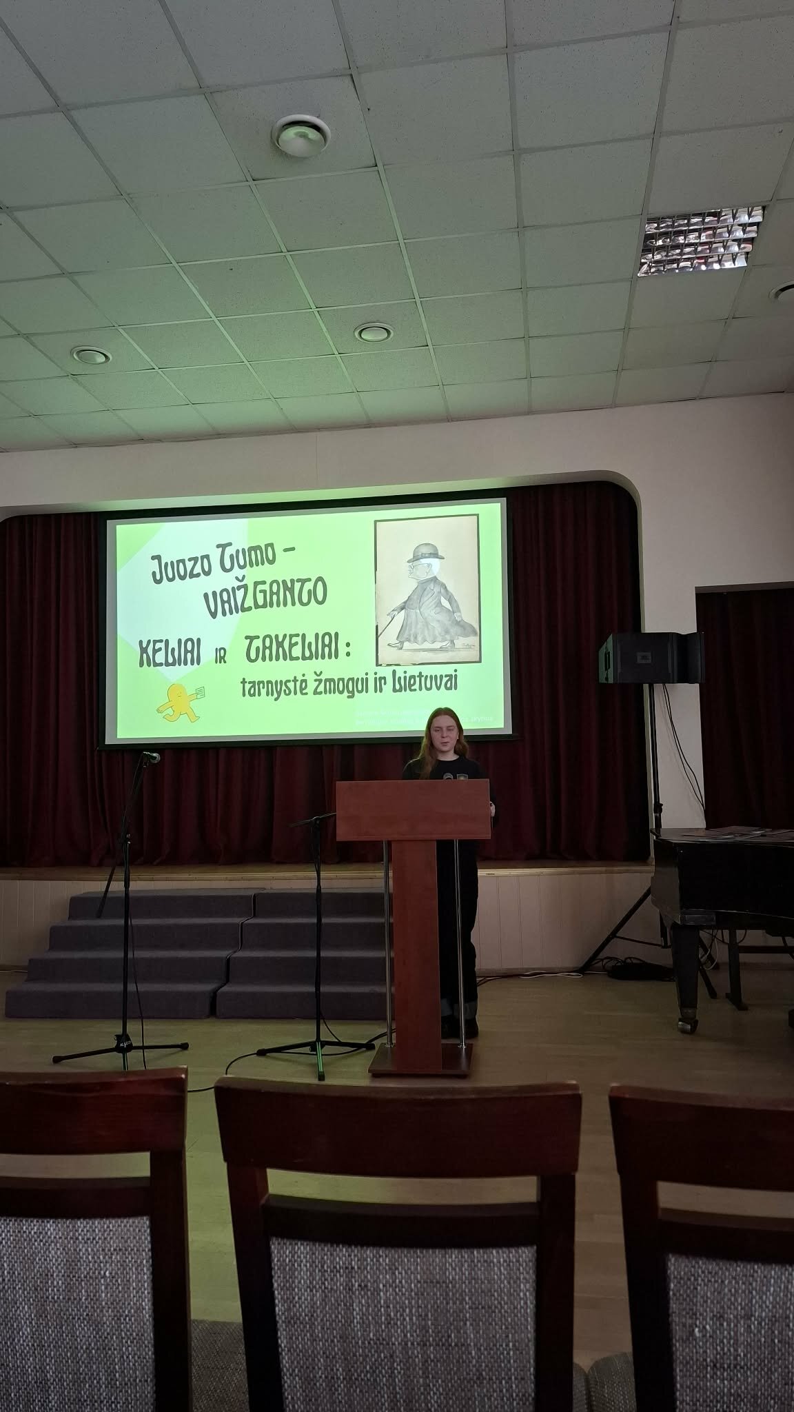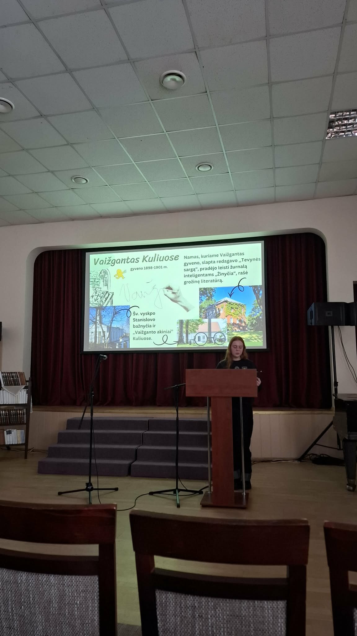 Kulių gimnazijos skyriaus I g klasės mokinė Guostė Golumbeckaitė pristatė pranešimą „Juozo Tumo – Vaižganto keliai ir takeliai: tarnystė žmogui ir Lietuvai”. Guostė papasakojo apie Vaižganto gyvenimo vingius keliaujant iš vienos parapijos į kitą – kiekvienoje jis imdavosi veiklos, naudingos Lietuvai, ir visada išlikdavo žmogiškas, gal dėl to žmonių labai mylimas.