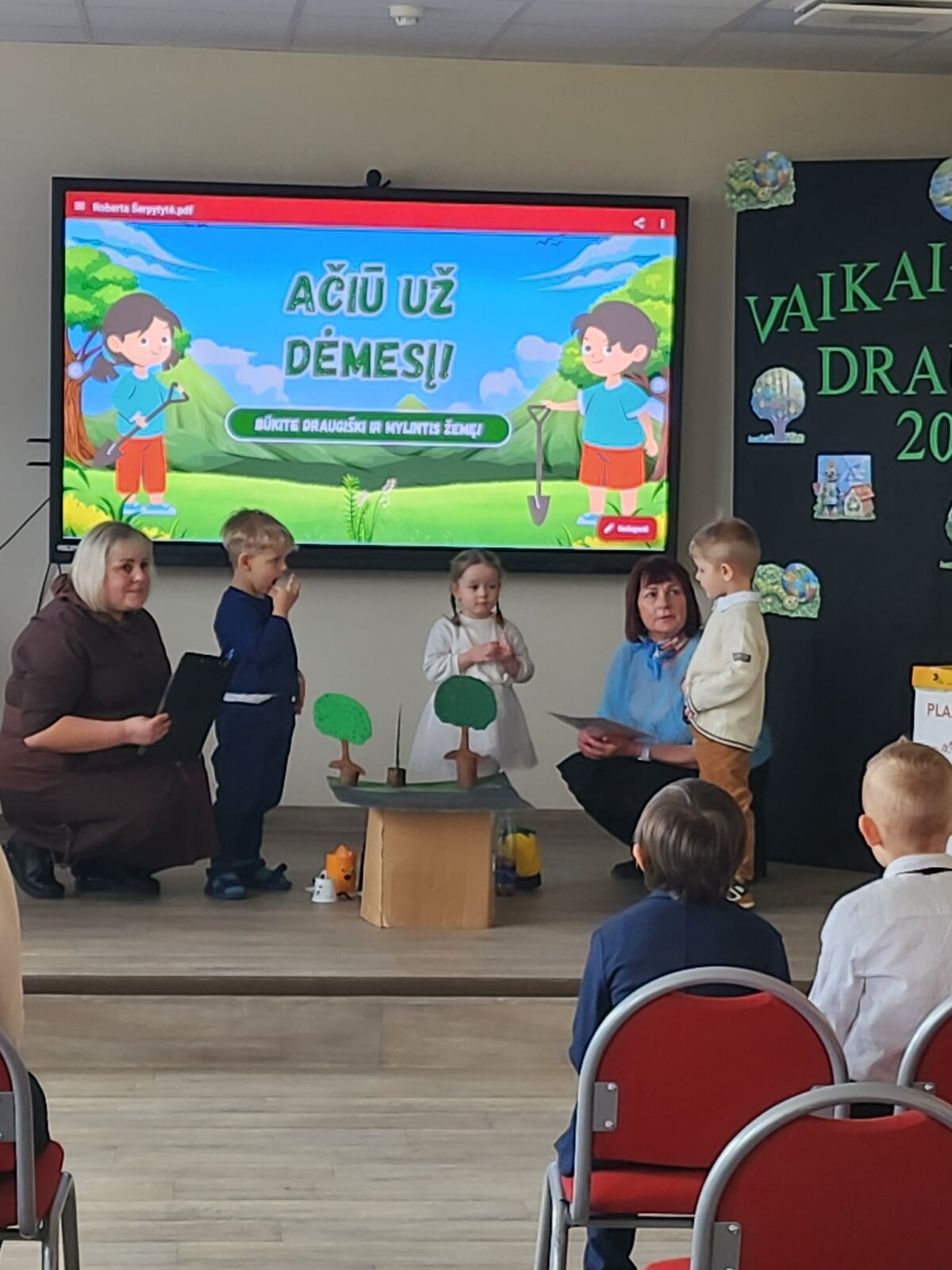Renginį paįvairino ir vaidinimas, kuriame pasirodė personažai – Žemė ir Šiukšlių ponia. Šis pasirodymas atskleidė, kokią žalą daro netinkamai tvarkomos atliekos. Vaikai aktyviai įsitraukė ir padėjo Šiukšlių poniai suprasti, kaip teisingai rūšiuoti atliekas bei saugoti gamtą.